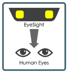 EyeSight trên xe Subaru so sánh các hình ảnh thấy được bởi hai camera thấu kính ba chiều được lắp gần gương chiếu hậu để phát hiện những nguy hiểm tiềm tàng phía trước giống như mắt của con người.
