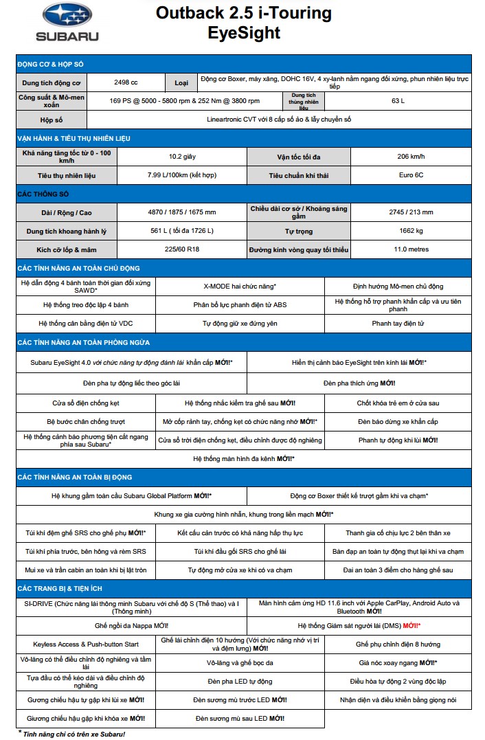 Thông số kỹ thuật: Outback 2.5i-TOURING EyeSight